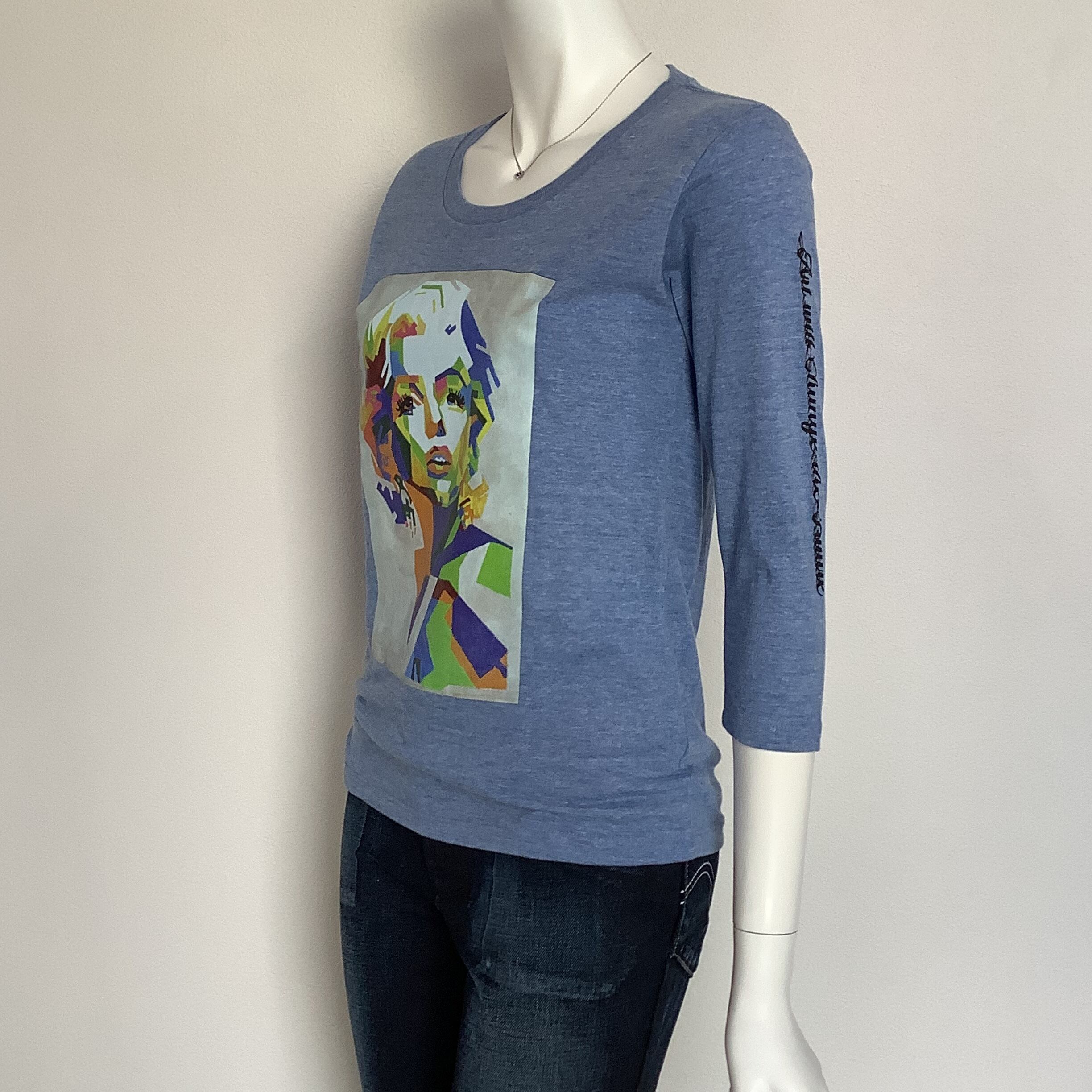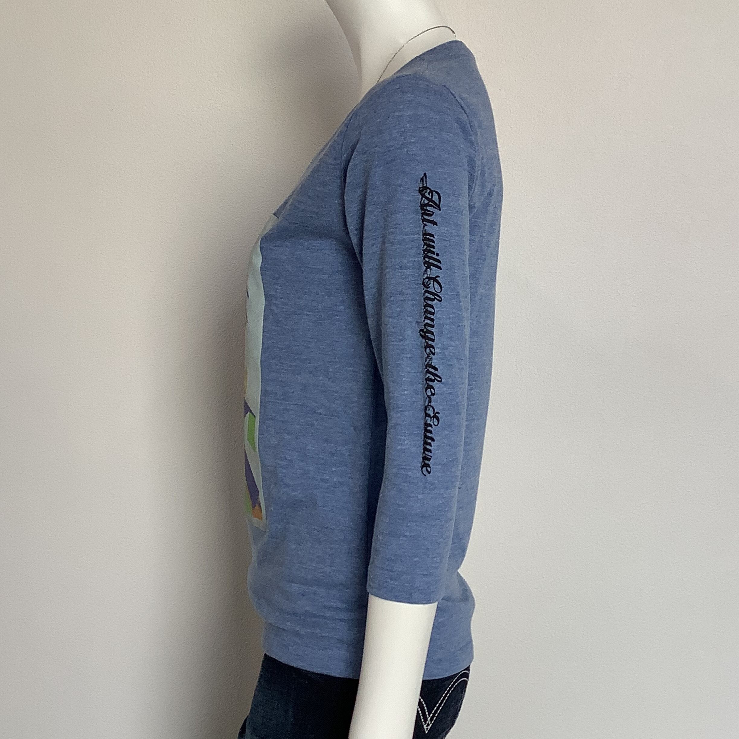 デザイン名 Vivid woman( 鮮やかな女性 ) 商品 七分袖Tシャツ カラー ヘザーブルー サイズ XS 価格 5,900円( 税込 ) 素材 綿38% ポリエステル38% レーヨン24% 【サイズ詳細( cm )】 XSサイズ 身丈 60 身幅 42 肩幅 36 袖丈 43